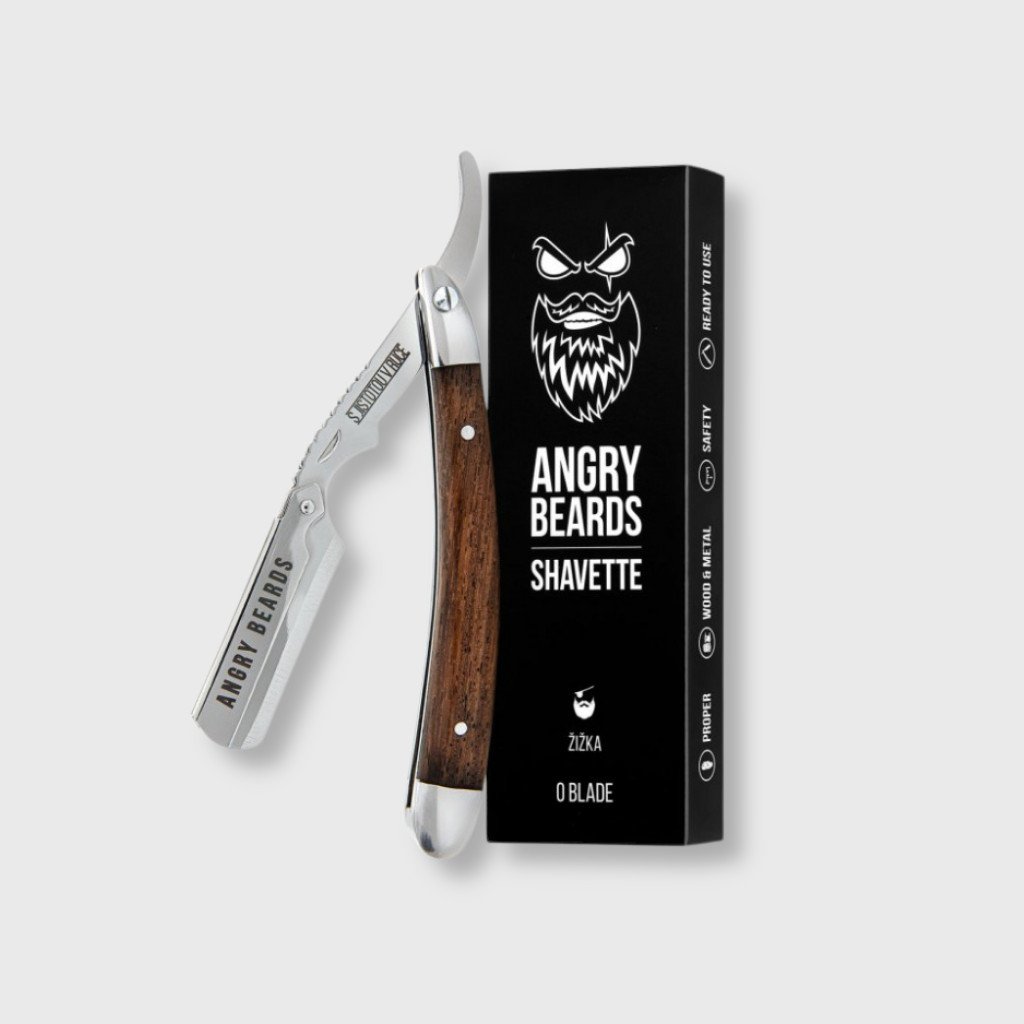 Holiaci strojček typu shavetta na klasické výmenné čepelky od českej značky Angry Beards. Aerodynamická rukoväť vyrobená z poctivej kombinácie ocele a palisandrového dreva. Oceľové rameno má výklopný zámok na žiletku s lesklou povrchovou úpravou. Dodáva sa s 1 holiacim strojčekom Derby Premium vo vegánskom koženom puzdre.
