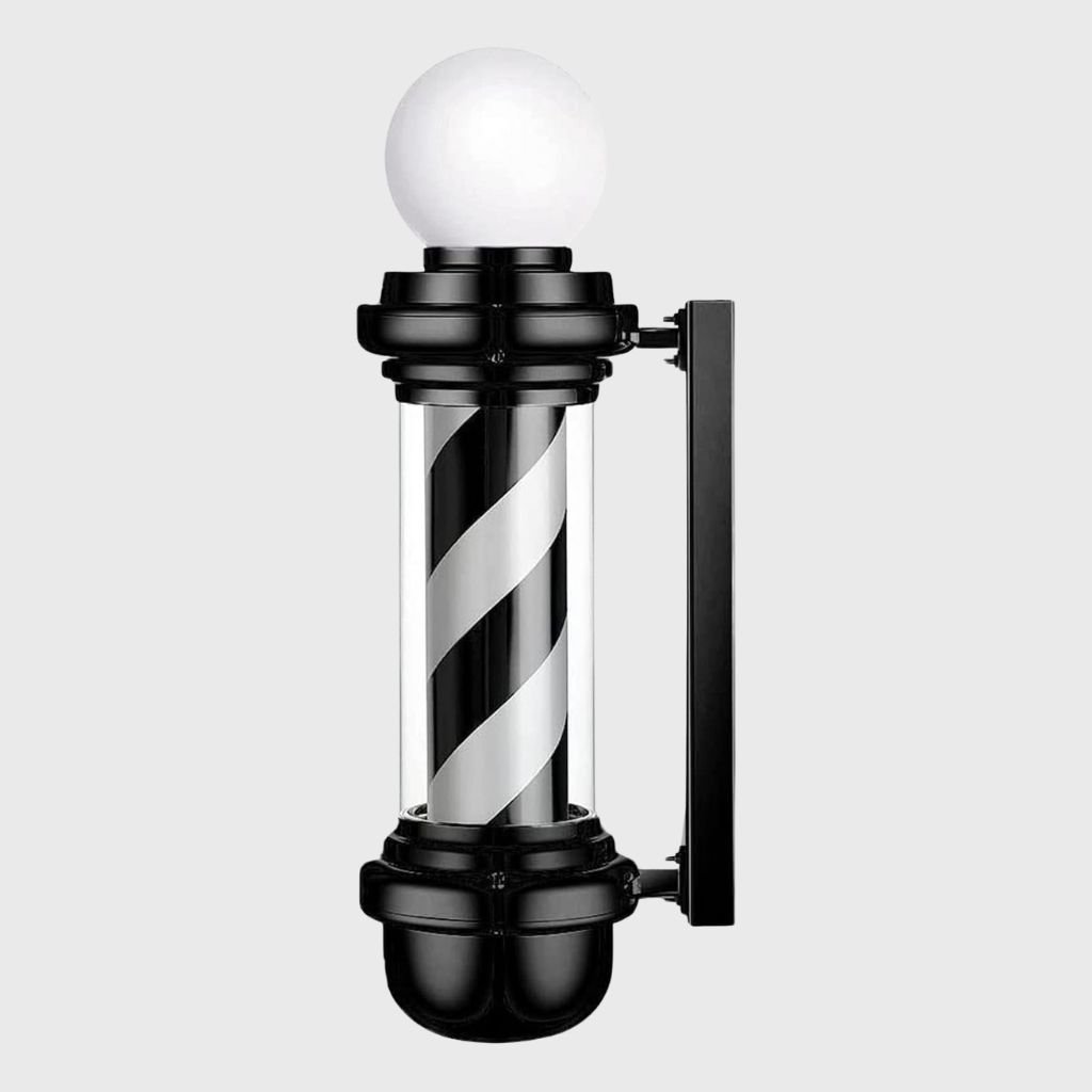 Čiernobiela holičská tyč s guľou na označenie holičstva alebo kaderníctva. Vhodné na použitie v exteriéri. Celková výška 85 cm.