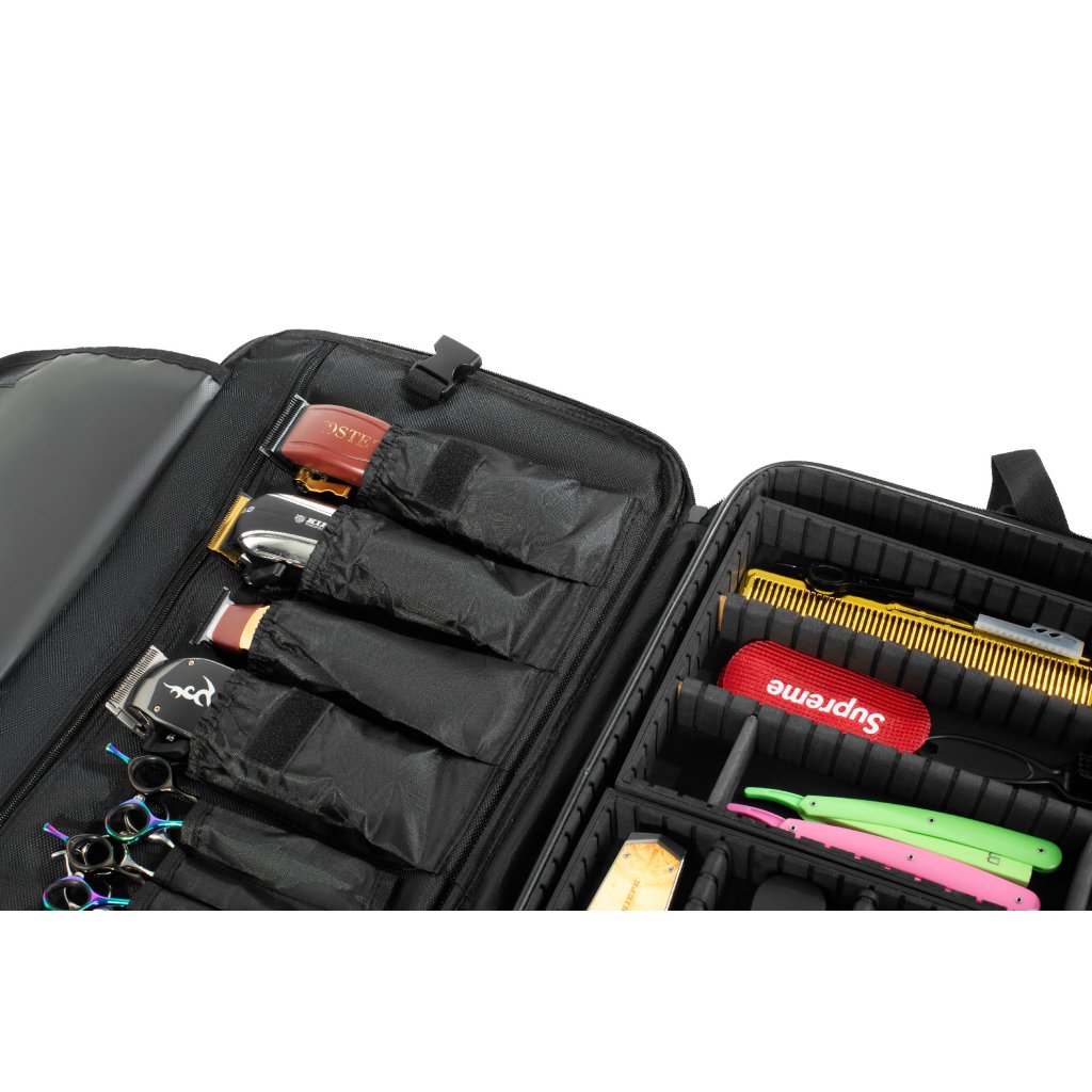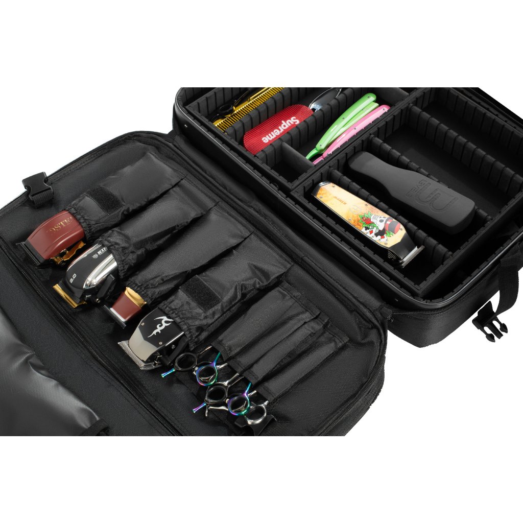 Ascari Elite Barber Backpack predstavuje kombináciu batohu a cestovného kufra na nástroje, doplnky a kozmetiku. Mimoriadne užitočné pre tých, ktorí často cestujú so svojím vybavením, napríklad na školenia, semináre, súťaže alebo keď klient necestuje za vami, ale vy za ním.
