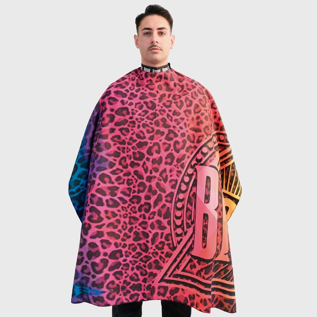 Profesionálna holičská pláštenka Blessed Acid Leopard Barber Cape s neoprénovým golierom, ktorý ponúka skvelé pohodlie a zabraňuje vnikaniu chĺpkov pod pláštenku.