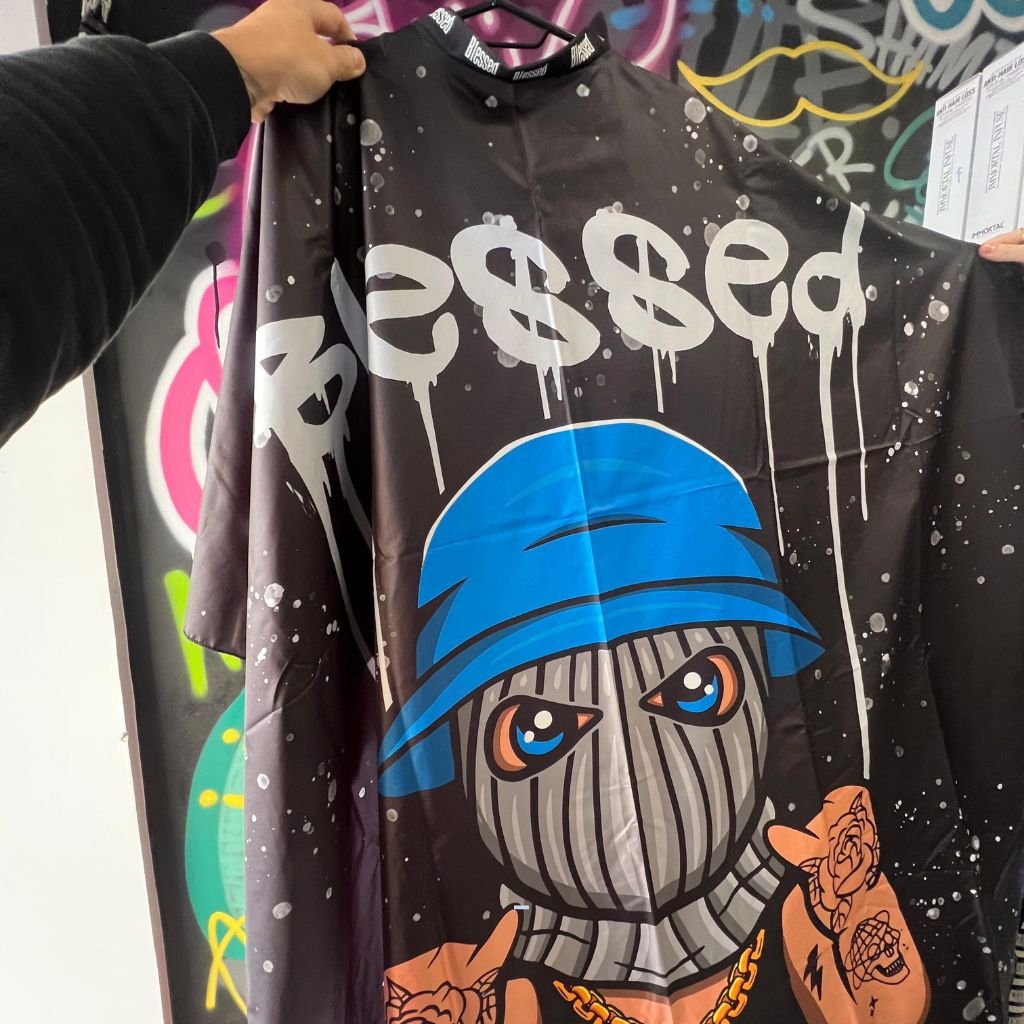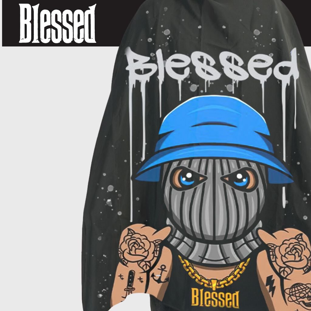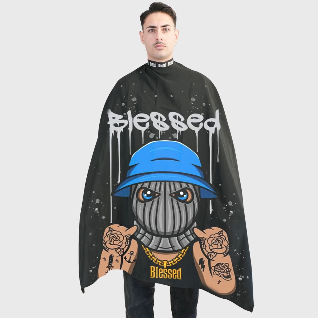 Profesionálna holičská pláštenka Blessed Cartoon Barber Cape s neoprénovým golierom, ktorý ponúka skvelé pohodlie a zabraňuje vnikaniu chĺpkov pod pláštenku.