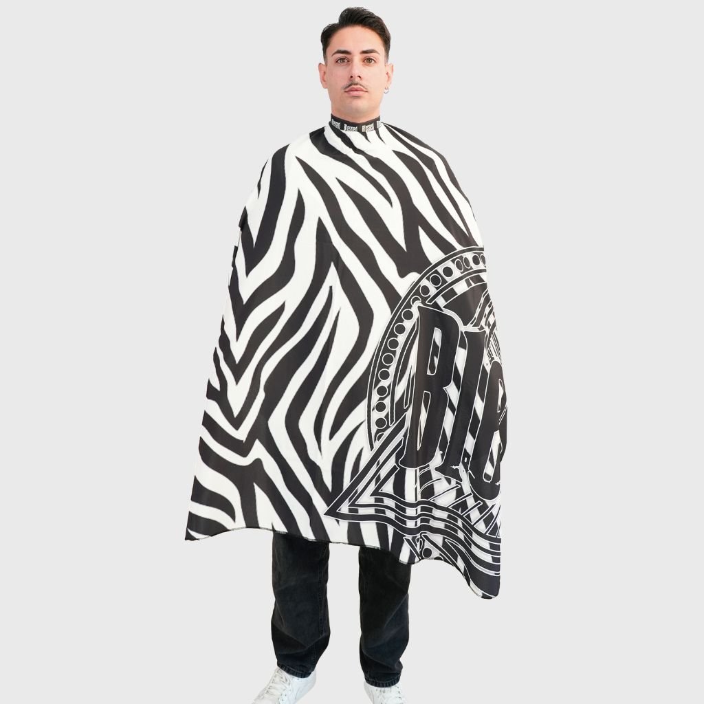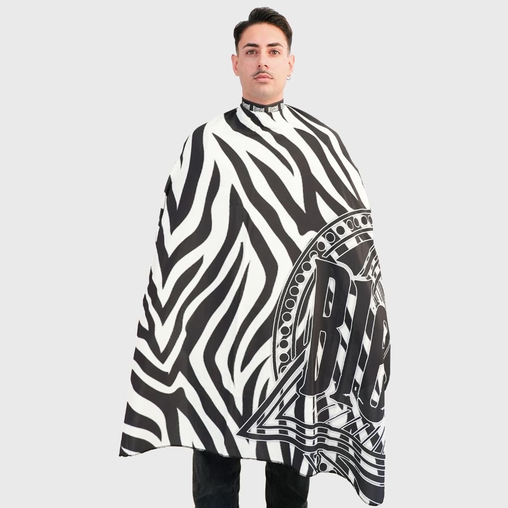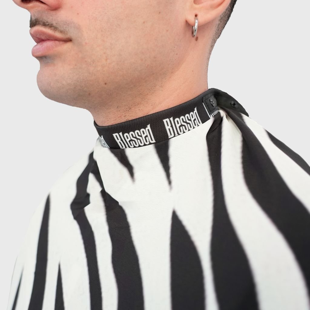 Profesionálna holičská pláštenka Blessed Zebra Barber Cape s neoprénovým golierom, ktorý ponúka skvelé pohodlie a zabraňuje vnikaniu chĺpkov pod pláštenku.