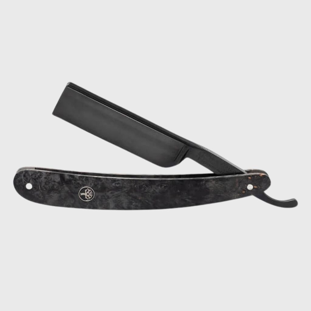 Sekera z exotického dreva Amboina má nápadne farebný vzor, ktorý miestami pripomína divoké uhlíkové vlákna. Drevo, ktoré pochádza z juhovýchodnej Ázie, vďačí za svoju zvláštnu štruktúru hľuzovitým výrastkom v oblasti koreňa, ktoré dodávajú každému nožu jedinečný charakter. Výrazný čierny a príjemne hladký povrch rukoväte sa dosahuje stabilizáciou dreva. Pri tomto špeciálnom procese sa zahriata epoxidová živica vtlačí do pórov dreva a potom sa vytvrdí. Baňatý tvar rukoväte úspešne kontrastuje s rovnou čepeľou a výrazne zvýrazňuje línie britvy.