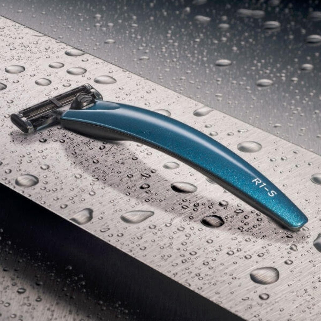 Moderný dizajnový holiaci strojček R1-S značky Bolin Web na hlavice Gillette Mach3. Rukoväť je v energickej modrej metalíze. Spodná časť rukoväte je protišmyková, vyrobená z gumy s antibakteriálnymi vlastnosťami. Dizajn je navrhnutý s dôrazom na pohodlné uchopenie a jednoduché čistenie.