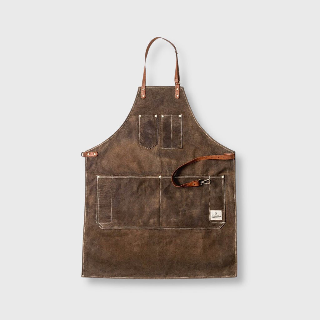 Rustikálna zástera z voskovaného plátna od anglickej barber značky Dapper Dan s koženými remienkami, vreckami a kovovými prackami.