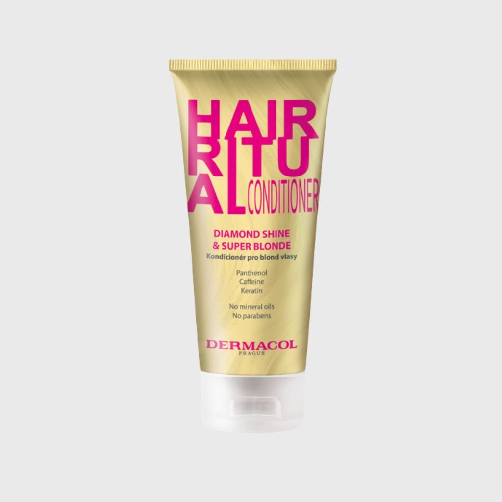 Dermacol Hair Ritual kondicionér pre blondy vlasy rozjasňuje vlasy a spolu s keratínom a pšeničným proteínom dodáva vašim vlasom žiarivý lesk a chráni intenzitu farby. Obsahuje kofeín, vitamín B3, makadamiový olej a bambucké maslo, ktoré vyživujú a regenerujú vlasové vlákno, zvyšujú jeho odolnosť a ochranu pred vonkajšími vplyvmi. Pantenol obnovuje vlhkosť suchých a krepovatých vlasov, zlepšuje ich vitalitu a pomáha ľahkému rozčesávaniu. Výsledkom sú žiarivo blond, lesklé a prirodzene silné vlasy.
