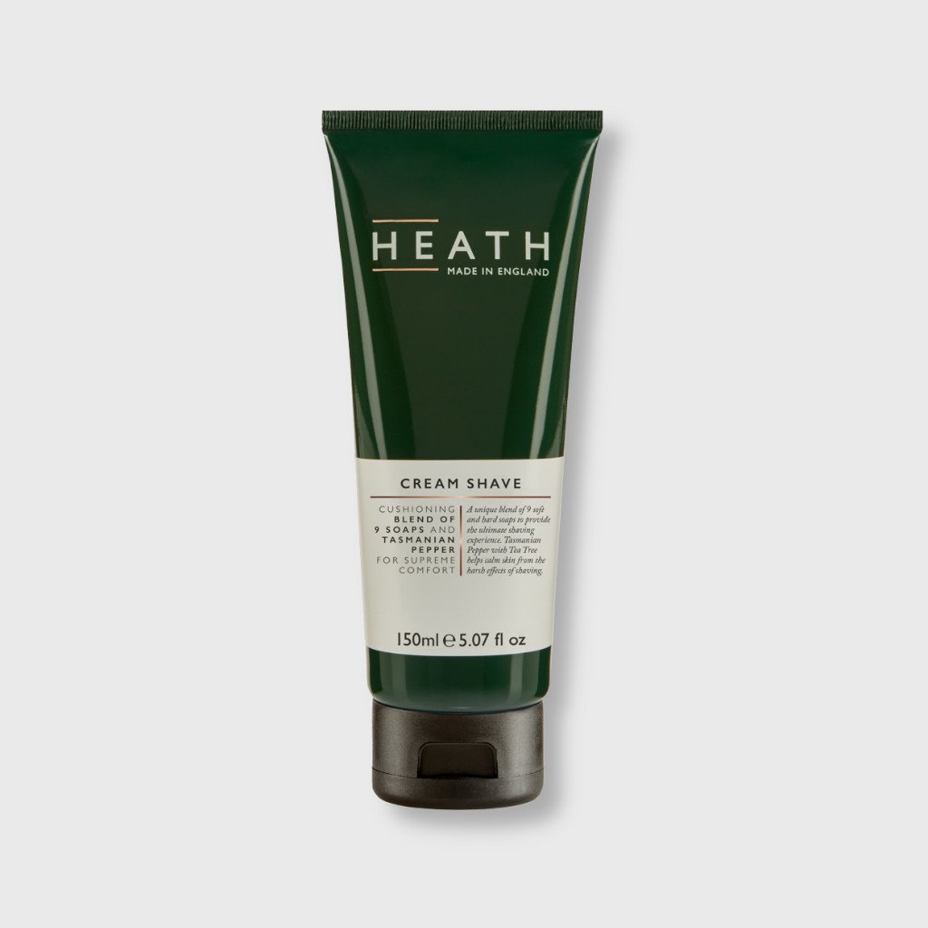 Krém na holenie Heath. Jedinečná kombinácia 9 mäkkých a tvrdých mydiel poskytuje dokonalý zážitok z holenia. Tasmánske korenie s čajovníkovým olejom pomáha upokojiť namáhanú pokožku.