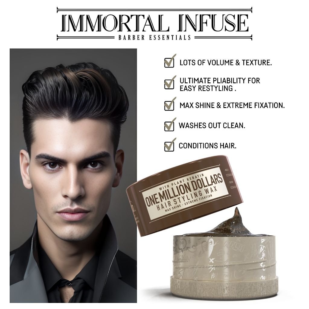 Vosk na vlasy Immortal Infuse One Million Dollars je vosk na vlasy s vysokým leskom a vysokou fixáciou. Obsahuje keratín na podporu vlasov a skvelú vôňu One Million.