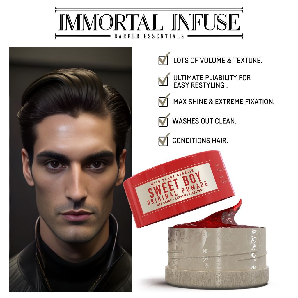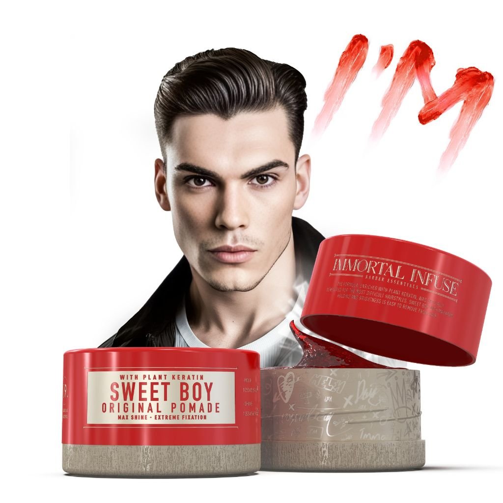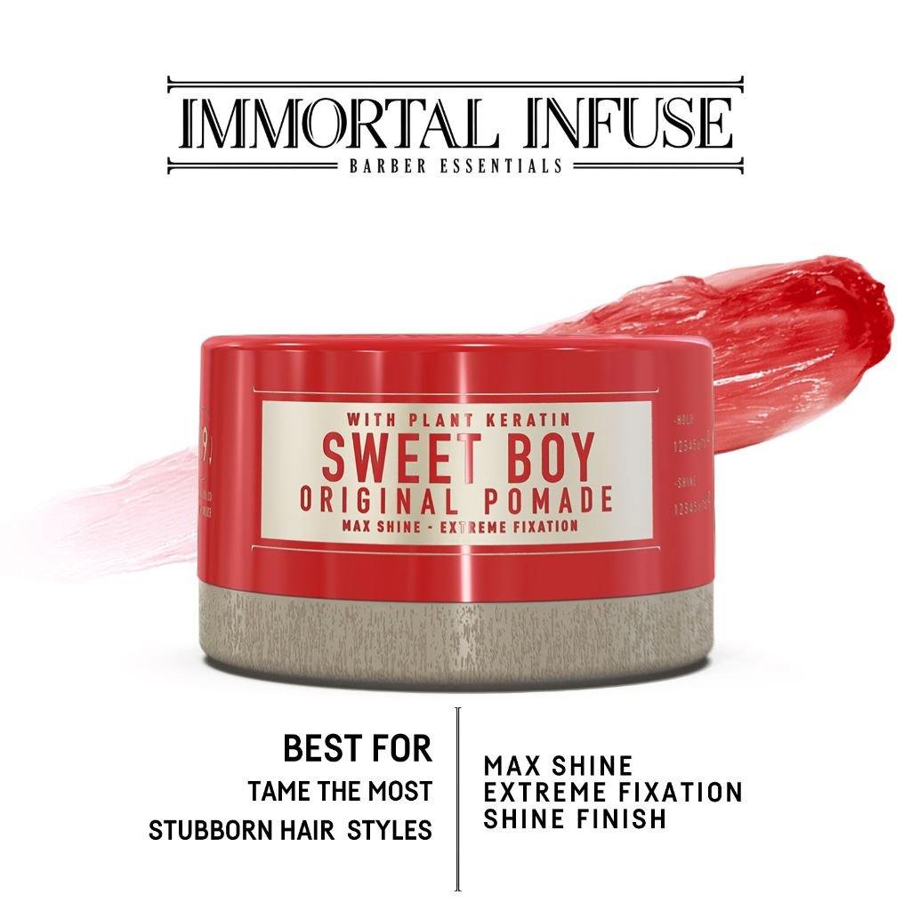 Immortal Infuse Sweet Boy Original Pomade je pomáda so skvelou fixáciou a leskom, ktorá obsahuje rastlinný keratín, ktorý slúži ako podpora vlasov.