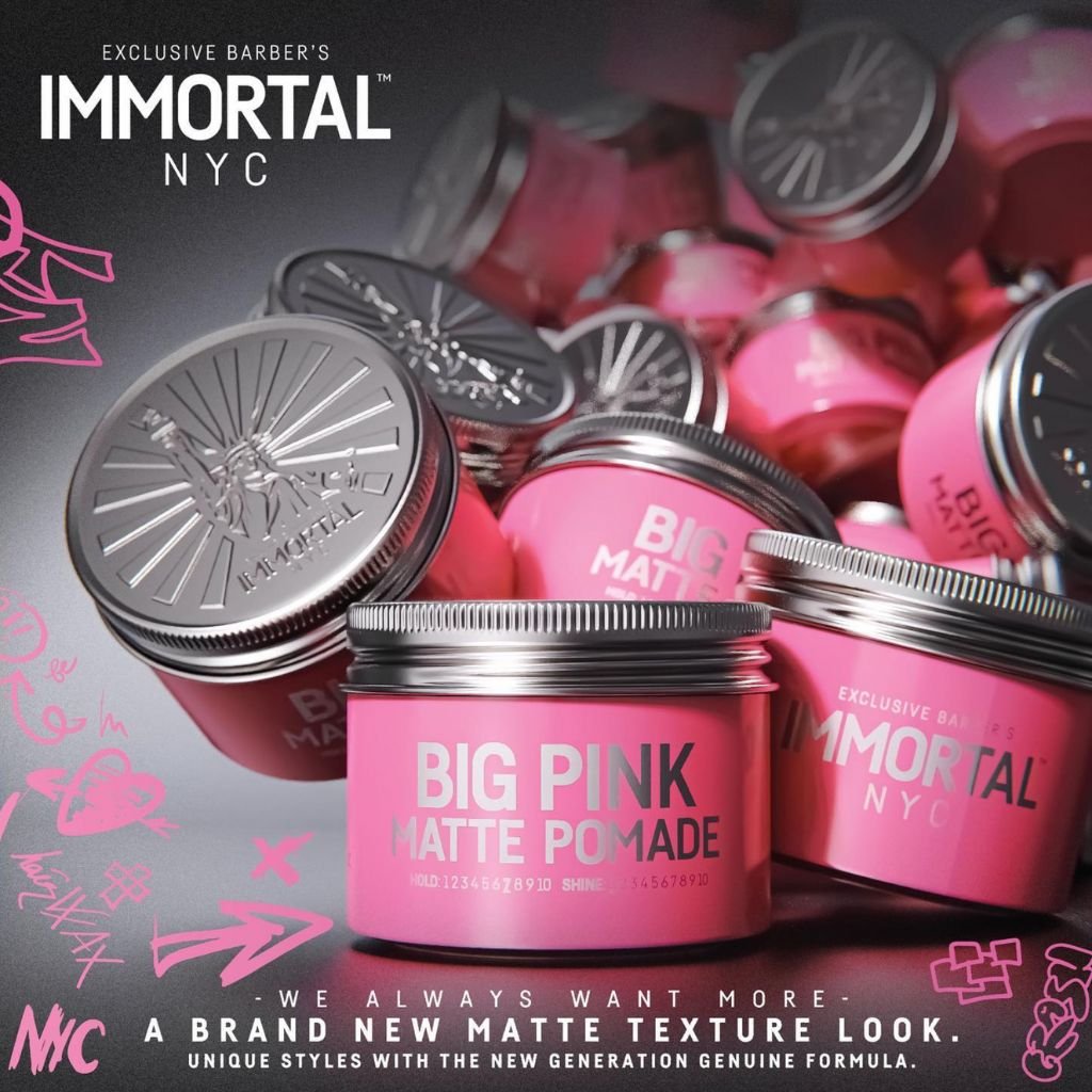 Immortal NYC Big Pink Matte Pomade je pomáda na úpravu vlasov špeciálne navrhnutá tak, aby vám pomohla dosiahnuť čo najlepší účes. Pomáda dodáva vlasom matný/prírodný efekt so strednou fixáciou a zároveň vlasy príjemne prevonia. Pomáda je na báze vody, takže sa z vlasov ľahko vymýva.