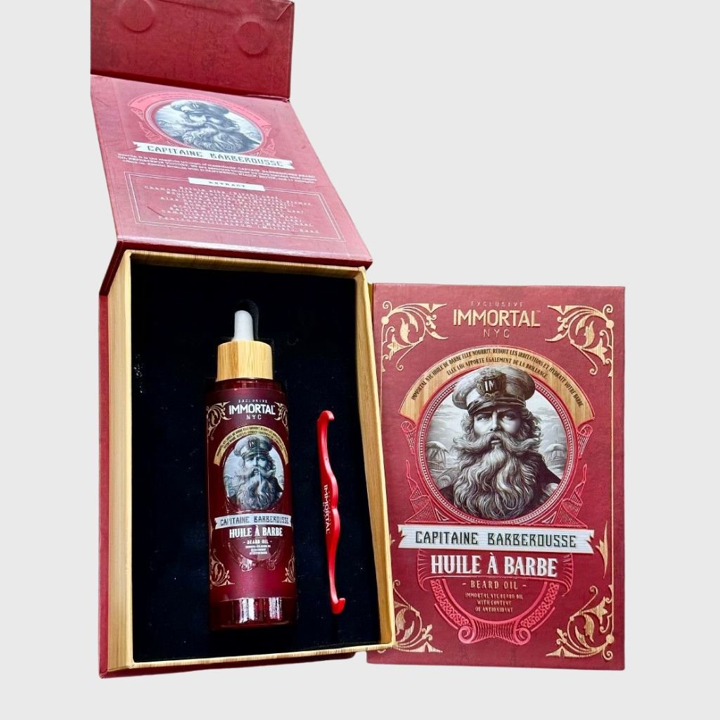 Immortal NYC Capitane Barberousse Beard Oil olej na fúzy v luxusnom boxe a hrebienkom na fúzy 100 ml