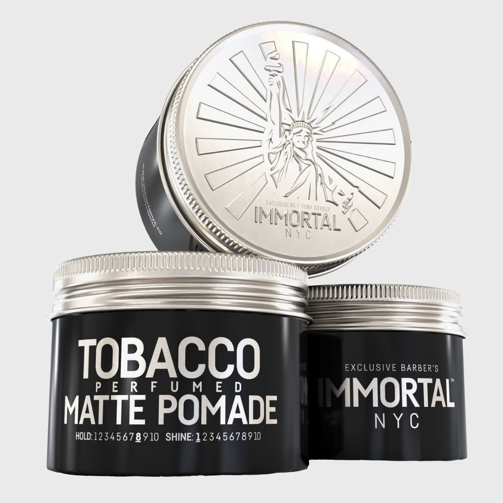 Profesionální barber matná pomáda Immortal NYC Tobacco Perfumed Matte Pomade, s dokonalou a mužnou vůní tabáku, vysoce silnou fixací a přirozeným, matným efektem pro váš účes. Nezanechává na povrchu vlasů žádné zbytky. Snadno se z vlasů odstraňuje mytím.