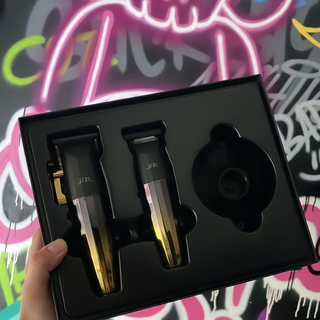 Cenově výhodná sada strojku a zastřihovače JRL FreshFade ve zlaté Gold barvě. Součástí balení je i nabíjecí stanice.