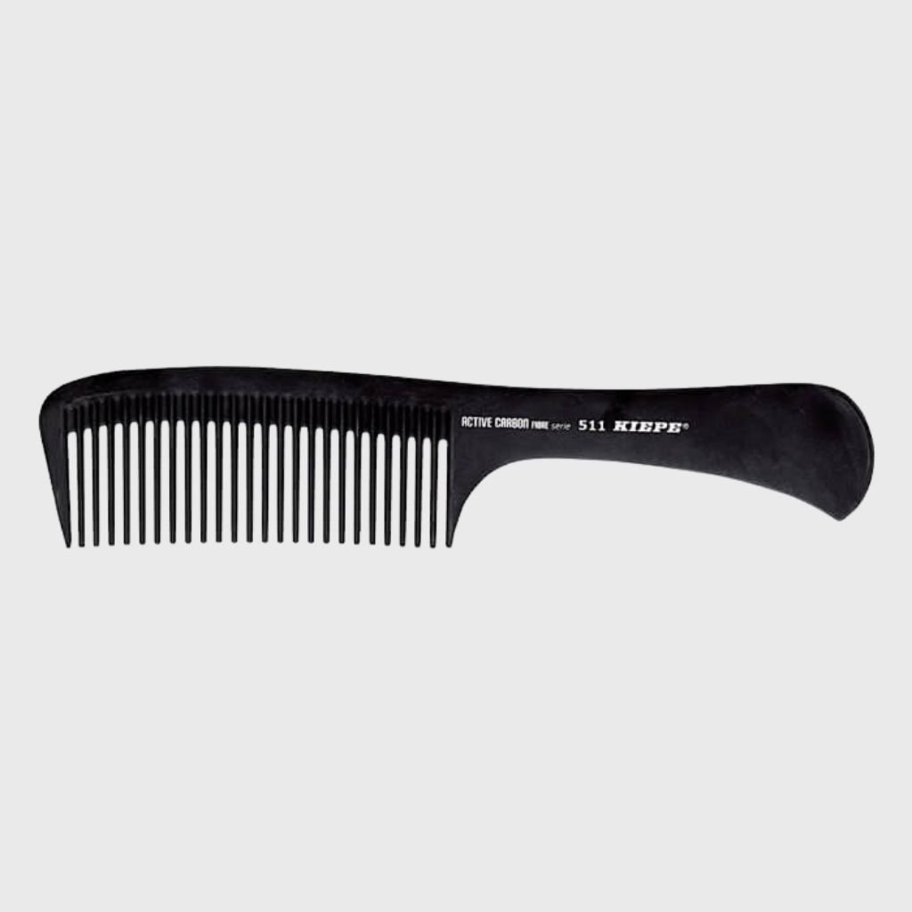 Hrebeň na vlasy Kiepe Active Carbon Series 511 je vyvinutý na profesionálne použitie. Antistatický a antibakteriálny, odolný voči teplotám do 230 °C a chemikáliám. Zaoblené zuby zabezpečujú jemnejší a šetrnejší kontakt s vlasmi a pokožkou hlavy. Počas používania sa uvoľňujú záporné ióny. Špeciálna prírodná rukoväť "Soft Touch".