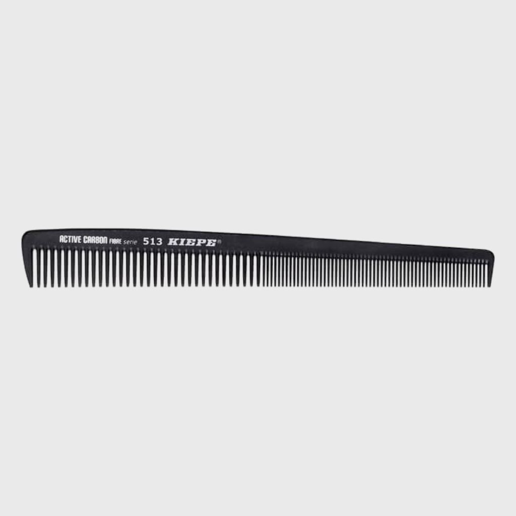 Hrebeň na vlasy Kiepe Active Carbon Series 513 je vyvinutý na profesionálne použitie. Antistatický a antibakteriálny, odolný voči teplotám do 230 °C a chemikáliám. Zaoblené zuby zabezpečujú jemnejší a šetrnejší kontakt s vlasmi a pokožkou hlavy. Počas používania sa uvoľňujú záporné ióny. Špeciálna prírodná rukoväť "Soft Touch".