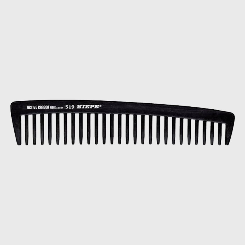 Hrebeň na vlasy Kiepe Active Carbon Series 519 je vyvinutý na profesionálne použitie. Antistatický a antibakteriálny, odolný voči teplotám do 230 °C a chemikáliám. Zaoblené zuby zabezpečujú jemnejší a šetrnejší kontakt s vlasmi a pokožkou hlavy. Počas používania sa uvoľňujú záporné ióny. Špeciálna prírodná rukoväť "Soft Touch".