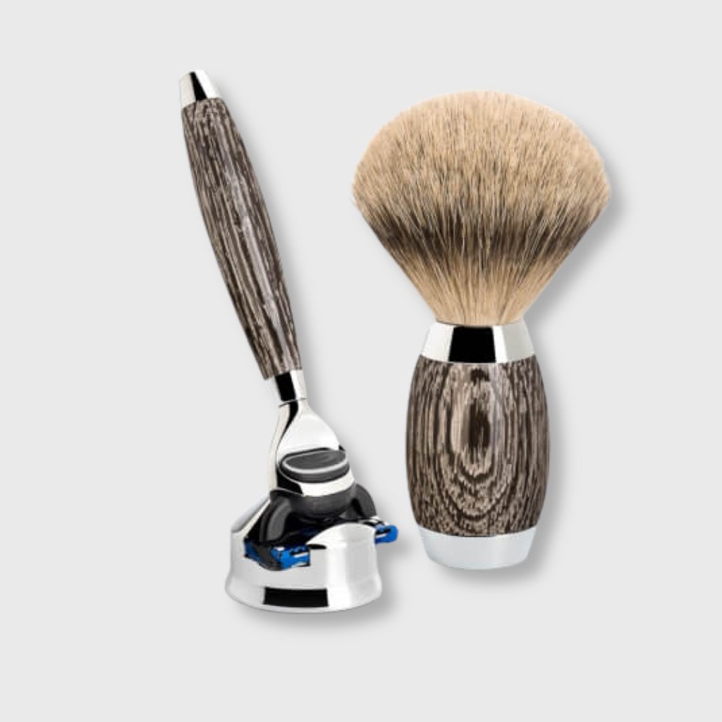 Luxusná trojdielna darčeková sada na holenie od Mühle. Rukoväť kefy a holiaceho strojčeka je vyrobená z bahenného duba v kombinácii s mincovým striebrom. Bahenné drevo ležalo v bažinách a močiaroch po tisícročia, čo mu dodalo krásny tmavý odtieň. Drevo je vyleštené mincovým striebrom, takže ryhy na povrchu majú jemný strieborný lesk. Povrch je lakovaný a leštený. Doplnky sú pochrómované. Dodáva sa v luxusnej bielej lakovanej drevenej darčekovej škatuli so zásuvkou. Vyrobené v Nemecku.