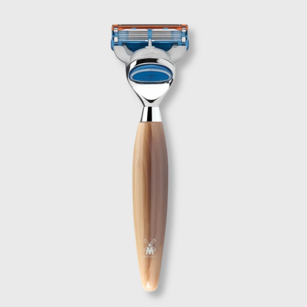 Kvalitný holiaci strojček Kosmo v nadčasovom dizajne na hlavice Gillette Fusion. Rukoväť vo farbe rohoviny je vyrobená z leštenej, vysoko odolnej živice. Vďaka prepracovanému tvaru sa stroj pohodlne drží. Kovové diely sú spracované do najmenších detailov a sú vyrobené z mosadze a pochrómované.