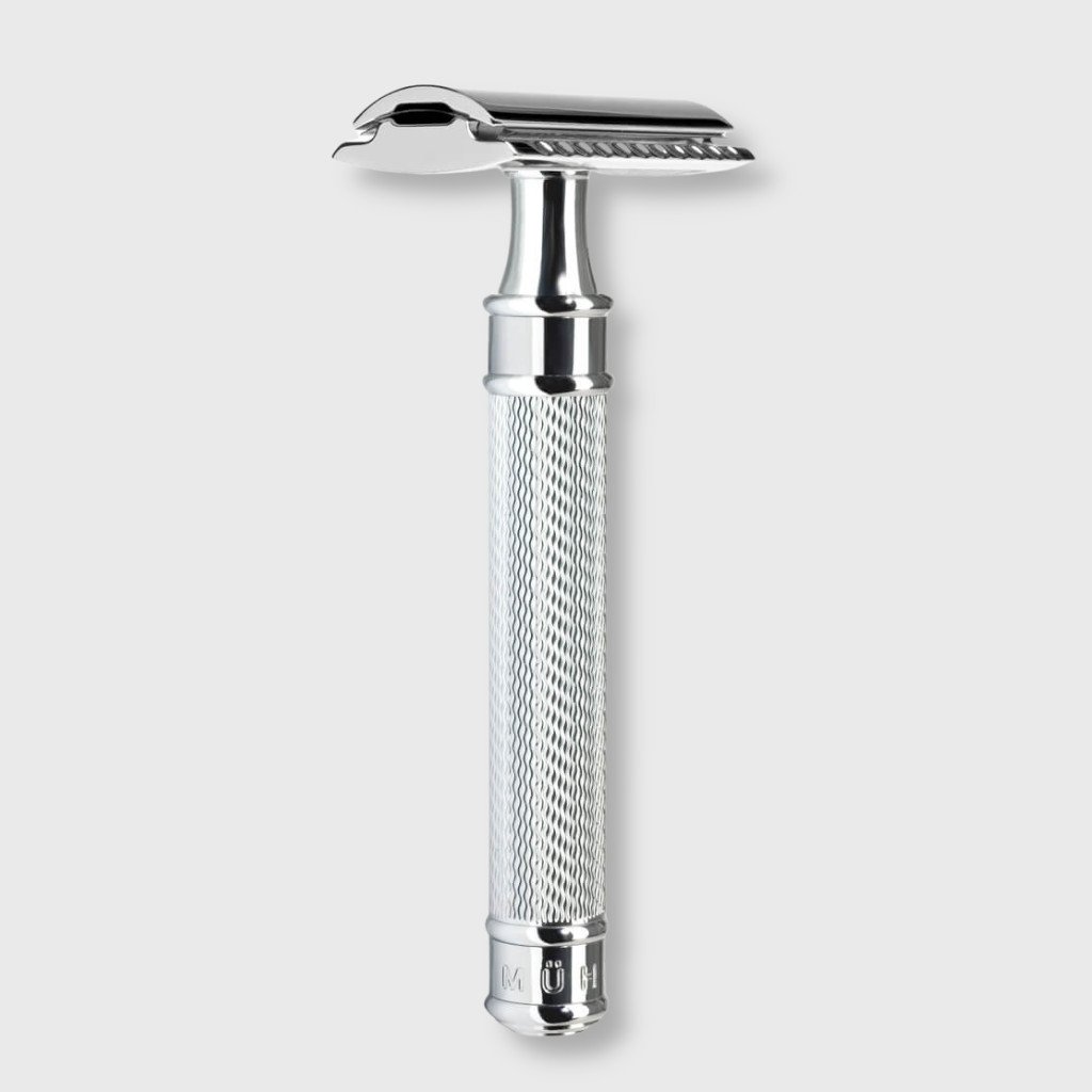 Tradičný holiaci strojček od Mühle na klasické žiletky. V porovnaní s klasickým modelom R89 je verzia Grande robustnejšia a dlhšia. Precízna ergonómia a krásny dizajn. Stroj je celokovový, pochrómovaný a má odskrutkovateľnú hlavu. Rukoväť je veľmi jemne zdobená.