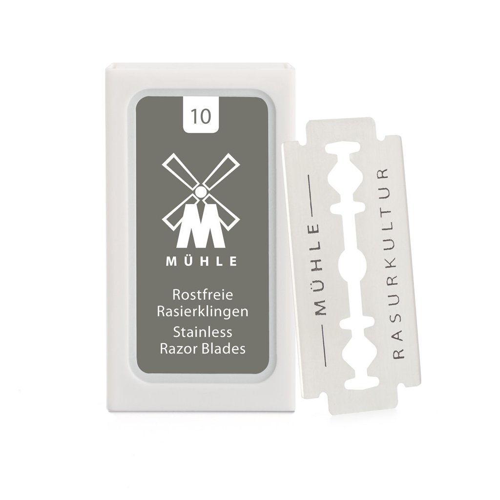Kvalitné žiletky z nerezovej ocele od značky Mühle. Čepele holiaceho strojčeka sú potiahnuté platinou, čo zaručuje kvalitné a hladké oholenie. Každý holiaci strojček je zabalený samostatne v papieri a celé balenie 10 holiacich strojčekov je v plastovej škatuli.
