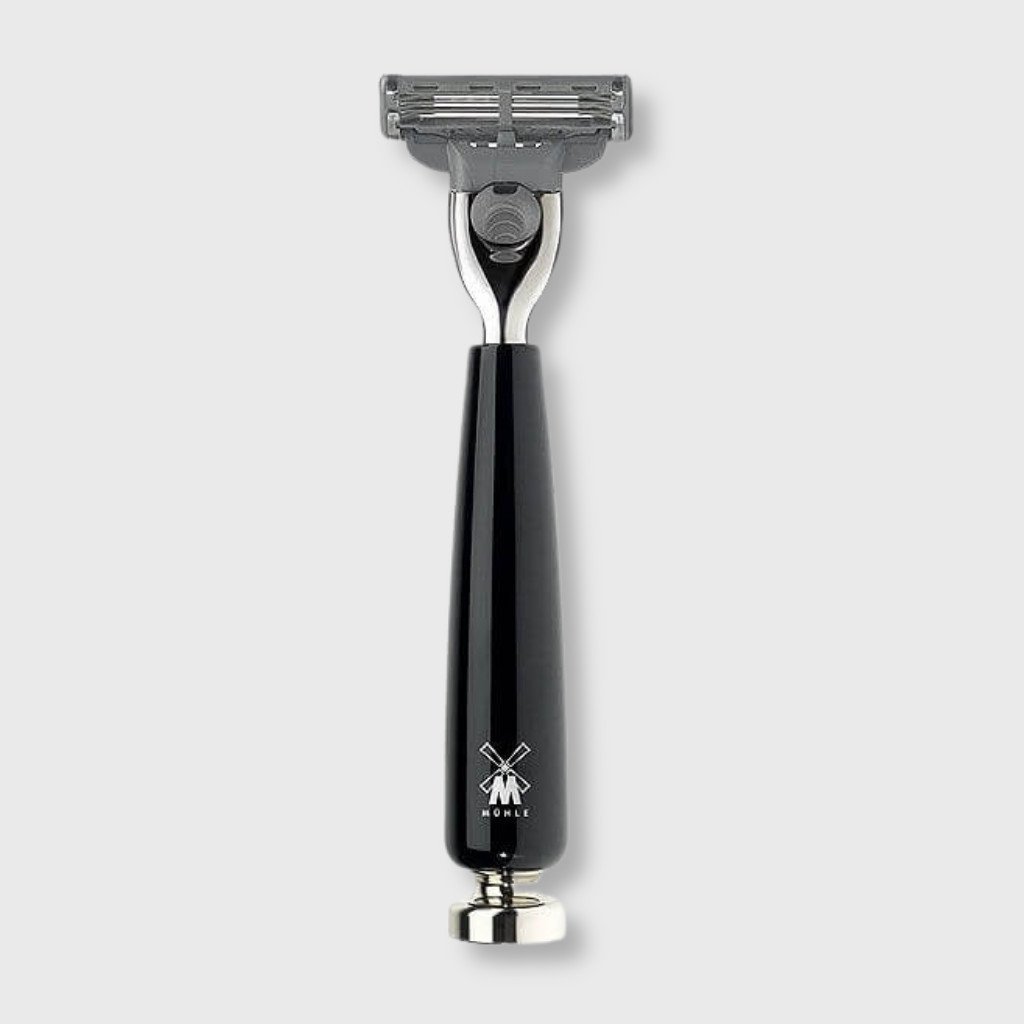 Krásny holiaci strojček Mühle Rytmo na hlavice Mach3. Rukoväť je vyrobená z leštenej vysoko odolnej živice. Vďaka prepracovanému dizajnu sa stroj pohodlne drží. Kovové časti sú vyrobené z mosadze a pochrómované. Dĺžka zariadenia je 125 mm a hmotnosť 46 g.