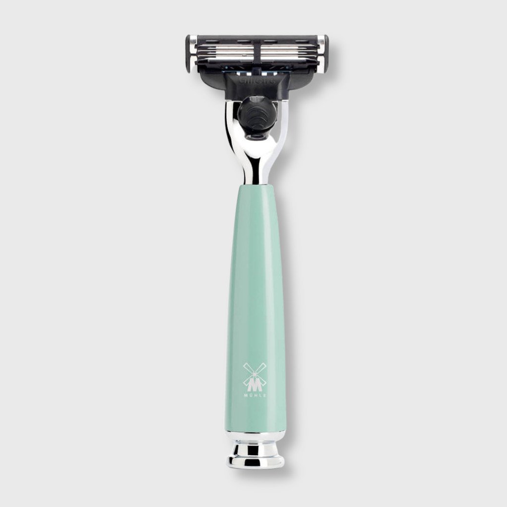 Krásny holiaci strojček Mühle Rytmo na hlavice Mach3. Rukoväť je vyrobená z leštenej vysoko odolnej živice mätovej farby. Vďaka prepracovanému dizajnu sa stroj pohodlne drží. Kovové časti sú vyrobené z mosadze a pochrómované. Dĺžka zariadenia je 125 mm a hmotnosť 42 g.