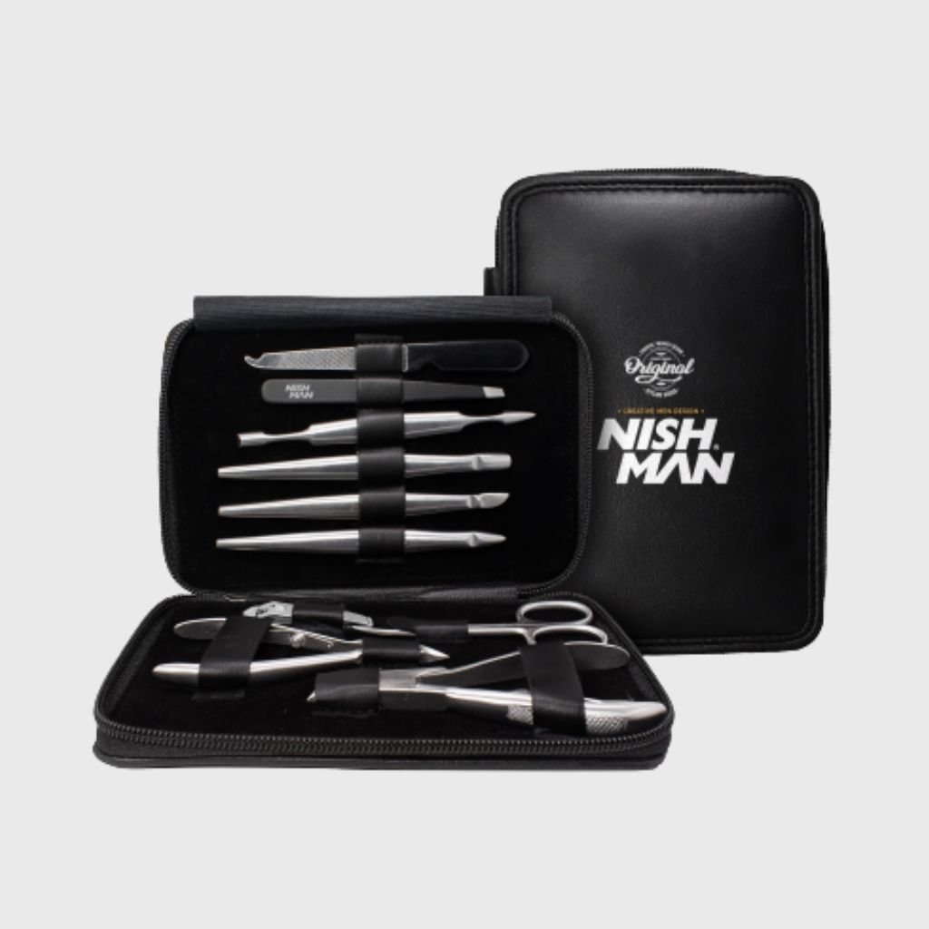 Luxusná pánska manikúrová súprava od NISH MAN. Nástroje na manikúru sú uložené v odolnom koženom puzdre.