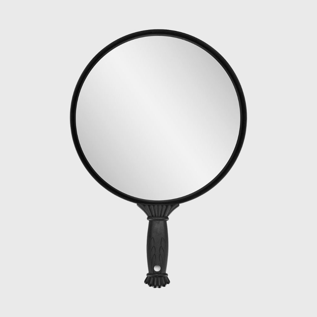 Holičské zrkadlo v čiernom puzdre s rukoväťou v spodnej časti. Ideálne na prácu v kaderníckom salóne, kde klientovi ukazujete účes na zadnej strane hlavy.