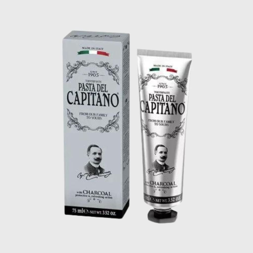 Pasta del Capitano 1905 Charcoal je zubná pasta s aktívnym rastlinným uhlím, ktoré účinne absorbuje látky spôsobujúce zafarbenie zubov a nepríjemný zápach. Táto zubná pasta chráni prirodzenú farbu zubov a zaisťuje dlhotrvajúci svieži dych bez poškodenia zubnej skloviny. Pravidelné používanie podporuje prirodzenú belosť zubov a jemne pôsobí proti farbiacim látkam, ako je káva, čaj a tabak.