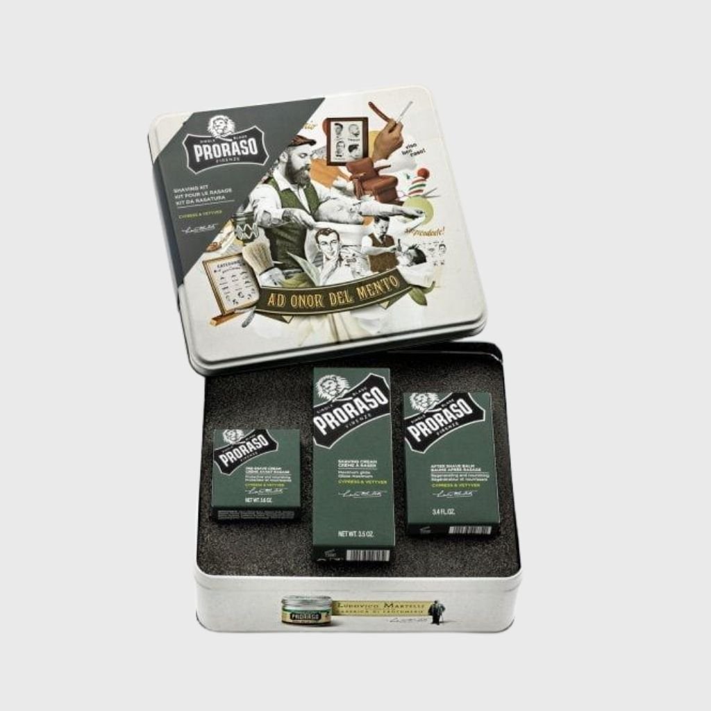 Darčeková sada na holenie od Proraso v plechovej darčekovej krabičke. Mužná vôňa cyprusu, ázijskej vetyverovej trávy a sviežeho bergamotu. Zvýhodnená cena v porovnaní so samostatným nákupom produktov. Dodáva sa v luxusnom darčekovom balení. Rozmery balenia 21,5 x 23 x 7,7 cm.