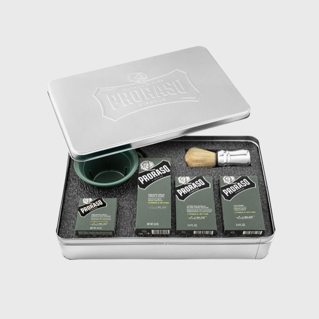 Veľká darčeková sada na holenie od Proraso so všetkým, čo môže fanúšik tradičného holenia potrebovať. Mužná vôňa cyprusu, ázijskej vetyverovej trávy a sviežeho bergamotu. Zvýhodnená cena v porovnaní so samostatným nákupom produktov. Dodáva sa v plechovej darčekovej škatuľke.
