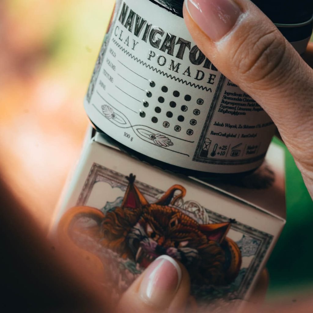 RareCraft Navigator Oil Based Clay Pomade nie je len obyčajná hlina na vlasy, ale skutočné umelecké dielo vytvorené významným poľským umelcom Alekom "Liskula" Morawskim. Dizajn obalu odráža jedinečný charakter výrobku, spája eleganciu a umeleckú víziu, vďaka čomu je Navigator hviezdou medzi výrobkami na úpravu vlasov. Je ideálnou voľbou pre tých, ktorí hľadajú textúru a objem vlasov a uprednostňujú elastickú hlinu na precízny styling náročných účesov. Vďaka svojmu jedinečnému zloženiu neobchádza vlasy a poskytuje úplnú kontrolu nad každým prameňom.