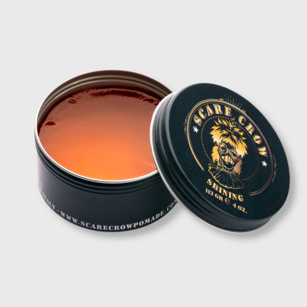 Dlhé hľadanie vybraných surovín umožnilo Scarecrow Pomade vytvoriť špeciálny lesklý vosk: SHINING. Výrobok vyvinutý do najmenšieho detailu, aby poskytol všestranné použitie profesionálom aj koncovým spotrebiteľom a umožnil veľmi jednoduché vytvorenie účesu.