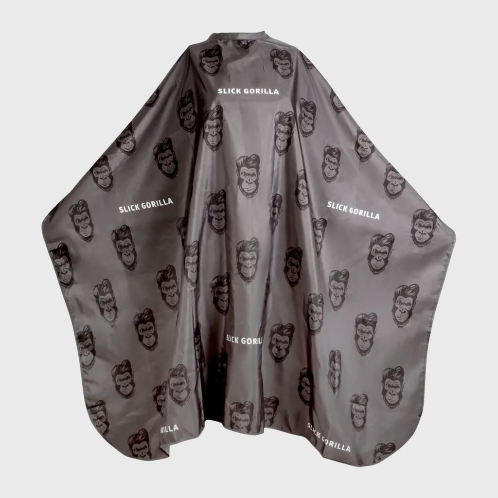 Slick Gorilla Barber Cape čierna kadernícka pláštenka vyrobená z hladkej luxusnej tkaniny podobnej hodvábu.