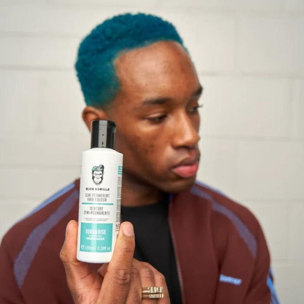Slick Gorilla Semi Permanent Hair Colour Turquoise – semi-permanentná farba na vlasy s objemom 100 ml, špeciálne navrhnutá pre mužov, ktorá ponúka výrazný a živý tyrkysový odtieň. Táto farba je ideálna na vytváranie jedinečných a odvážnych vzhľadov a vďaka vysokokvalitným farebným pigmentom dosahuje verný tón na krátkych až stredne dlhých vlasoch.