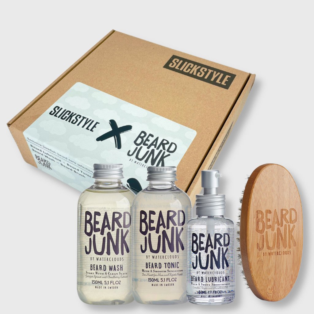 Dárková sada pro péči o vousy obsahující prémiové produkty Beard Junk od švédské značky Waterclouds.