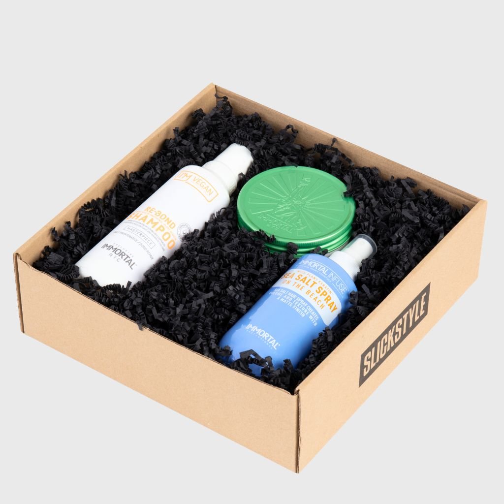 Stylingové produkty Immortal sú naším absolútnym bestsellerom. Táto súprava ponúka všetko, čo muž potrebuje pre štýlové a zdravé vlasy. Táto súprava zaručuje jednoduchý styling a starostlivosť o vlasy bez kompromisov - od revitalizačného šampónu cez textúrujúci sprej s morskou soľou až po ultra matnú pomádu. Je to ideálny darček k narodeninám, Vianociam alebo akejkoľvek inej špeciálnej príležitosti pre každého muža, ktorý chce vyzerať skvele.