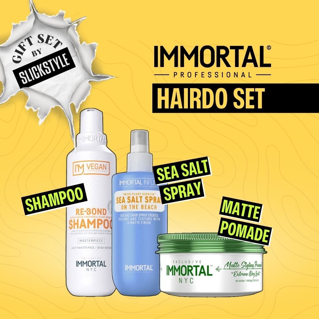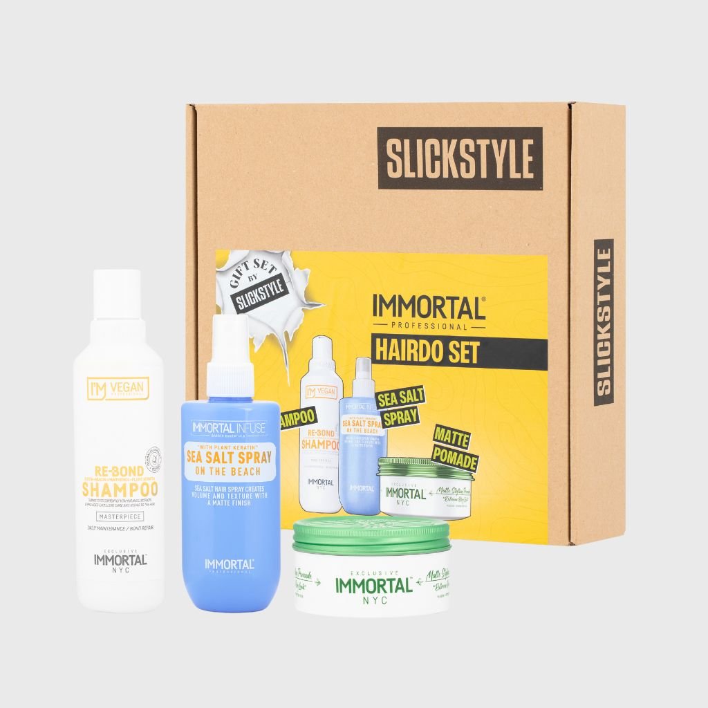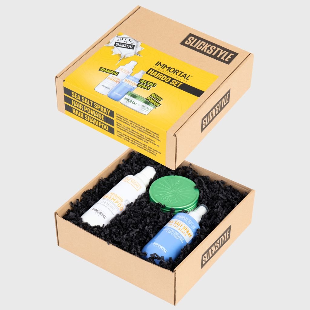 Objavte perfektný darček pre každého muža, ktorý si zakladá na svojom vzhľade - Slickstyle x Immortal Hairdo Set, sada troch prémiových produktov pre komplexnú starostlivosť o vlasy. Táto exkluzívna súprava spája špičkovú kvalitu, inovatívne receptúry a jednoduché používanie, takže je ideálnym darčekom pre každého muža, ktorý chce mať vždy dokonale upravené vlasy.