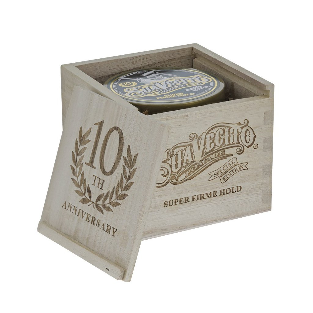 Limitovaná edícia pomády na vlasy Suavecito vytvorená k 10 ročnému výročiu tejto značky. Má veľmi silnú fixáciu a dodáva vlasom stredný lesk. Účes vydrží celý deň. Je na báze vody, takže sa z vlasov ľahko vymýva. S originálnou vôňou Suavecito. Táto špeciálna edícia sa dodáva v plastovej škatuľke zlatej farby a v drevenej škatuľke s logom výročia. Pekný darček pre fanúšikov tejto značky.