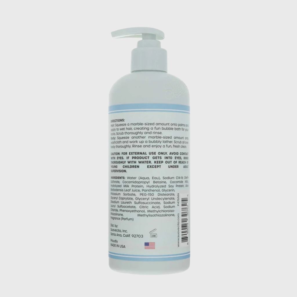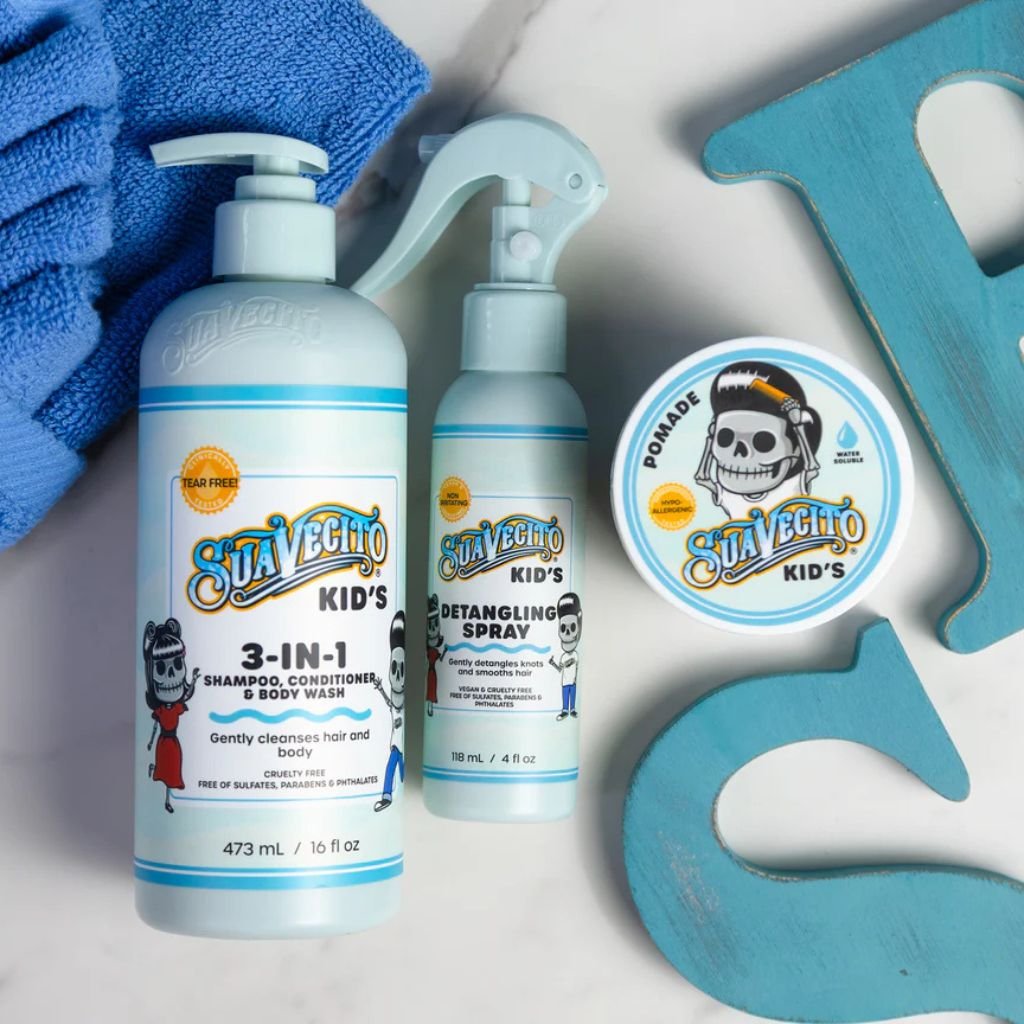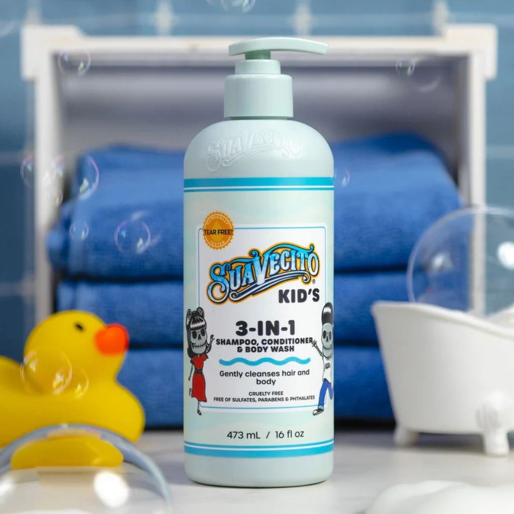 Suavecito Kids 3in1 je zábavný a praktický sprchový gél, šampón a kondicionér v jednom, navrhnutý špeciálne pre deti. Toto jemné zloženie bez krutosti bolo klinicky testované, aby sa zabezpečilo kúpanie bez slz a stresu. Je úplne bez sulfátov, parabénov a ftalátov, čo zaručuje bezpečnú a jemnú starostlivosť o detské vlasy a pokožku.