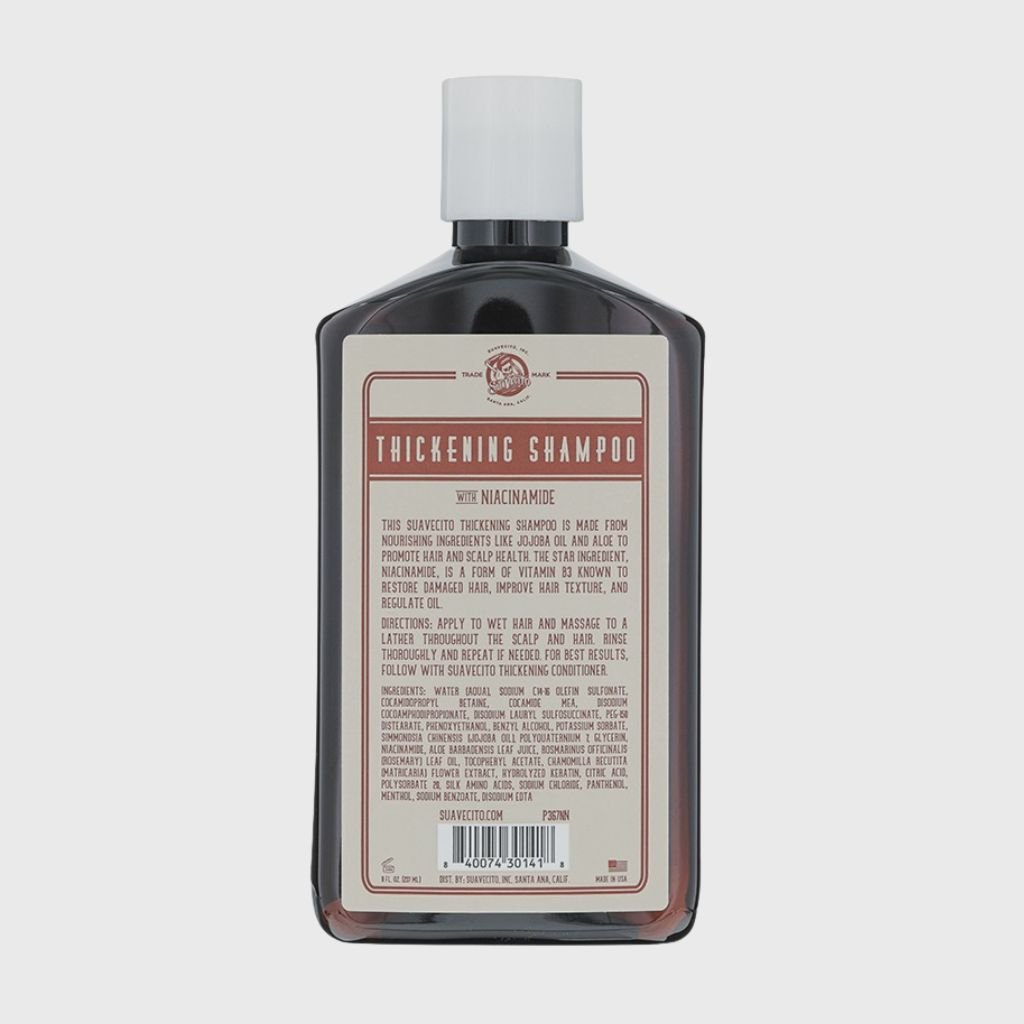 Šampón Suavecito Thickening Shampoo na zahusťovanie vlasov obsahuje niacínamid a ďalšie zložky, ktoré sú obľúbené v šampónoch proti vypadávaniu vlasov pre svoje účinky na rast vlasov. Rozmarínový olej sa bežne používa na podporu rastu vlasov podobne ako minoxidil. Pantenol má priaznivé účinky na hustotu vlasov a zadržiavanie vlhkosti. Šťava z listov aloe barbadensis pomáha podporovať zdravú pokožku hlavy a pomáha upravovať a obnovovať poškodené vlasy, udržiavať folikuly čisté a zdravé.