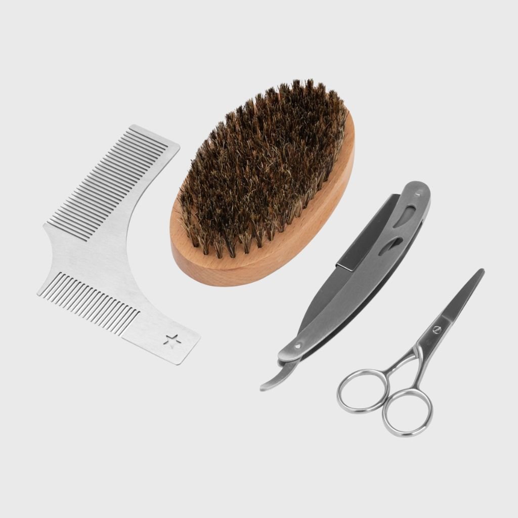 Súprava na úpravu fúzov - hrebeň, kefa, shavetta, nožnice