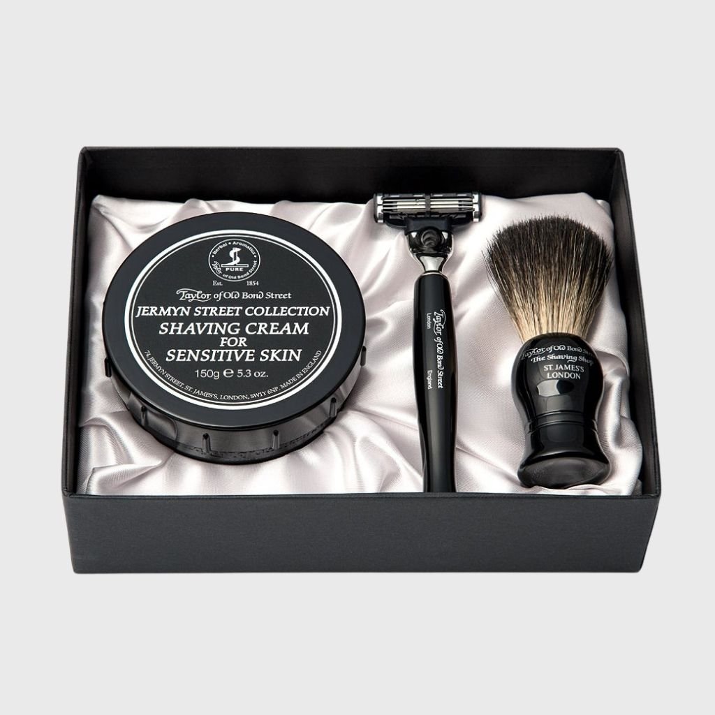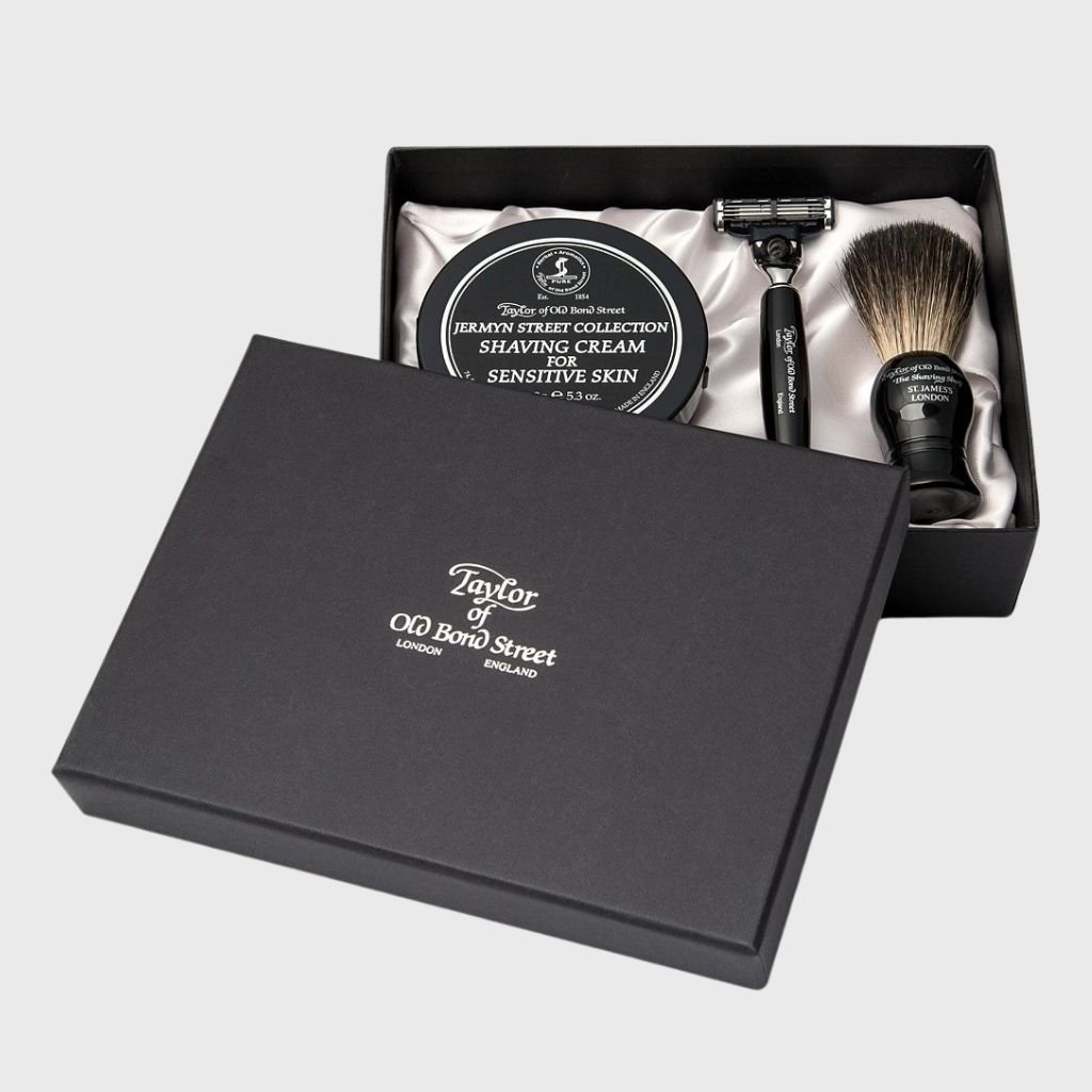 Luxusná holiaca sada kolekcie Jermyn Street od Taylor of Old Bond Street je ideálnym darčekom pre každého muža. Obsahuje holiaci strojček Jermyn Street Mach 3, štetku na holenie Pure Badger z jazveca a mydlo na holenie Sensitive Skin (150 g). Všetko v krásnej darčekovej krabici.