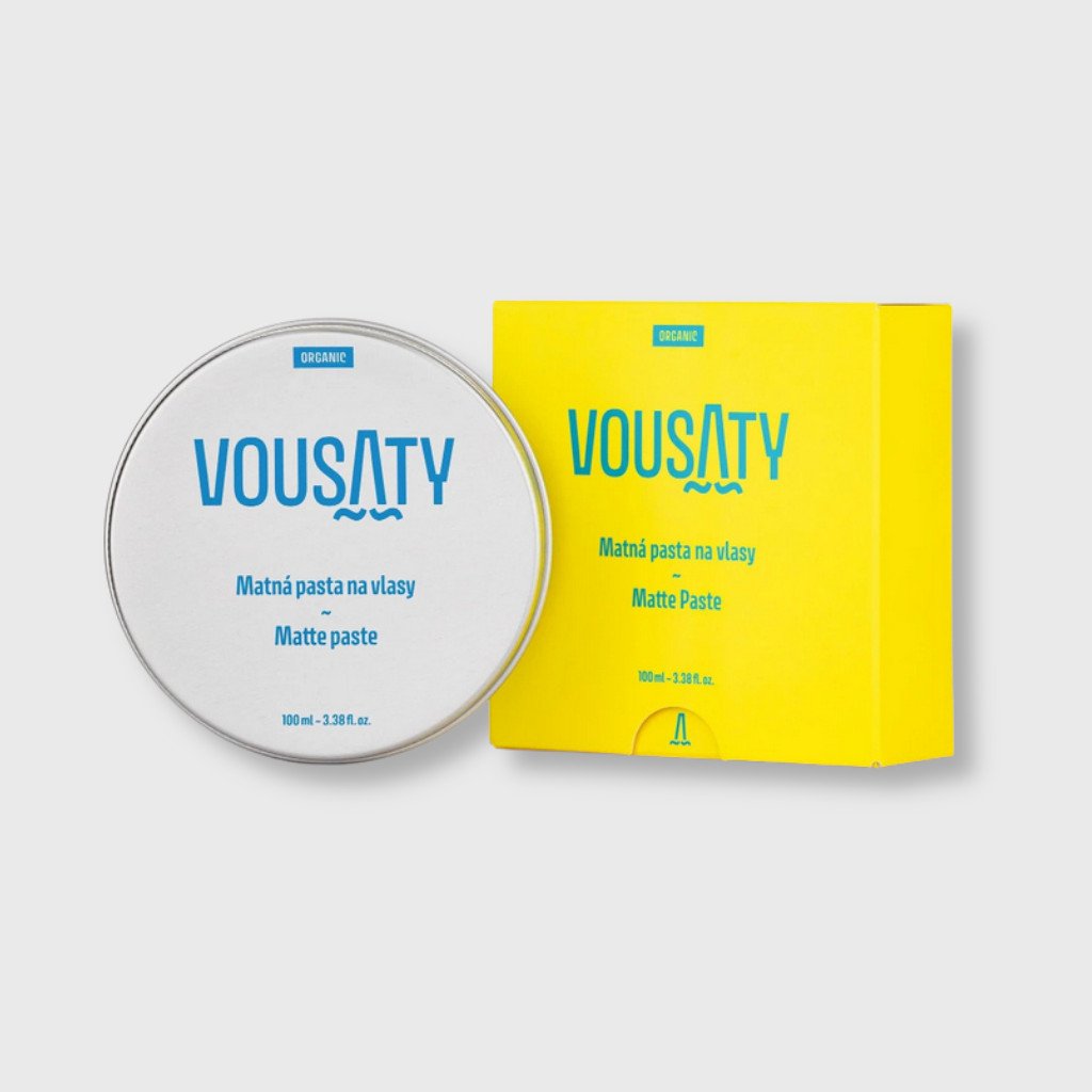 Matná pasta na vlasy od českej značky Vousaty má strednú fixáciu a dodáva vlasom matný vzhľad. Namiesto obyčajnej vody sa používa šťava z aloe vera, voda z pomarančových kvetov a mätová voda. Bambucké a kakaové maslo v kombinácii s avokádovým olejom a rakytníkovým olejom dodávajú vlasom výživu a hydratáciu. Pasta je určená skôr pre kratšie vlasy. S vôňou fazule tonka, vanilky, cédrového dreva a mäty.