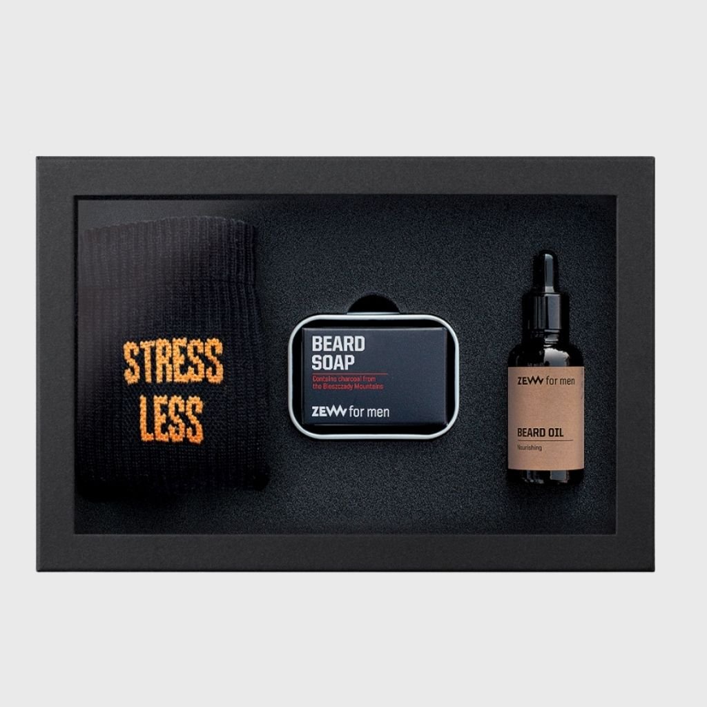 Súprava ZEW for men obsahuje mydlo na fúzy 85 ml v hliníkovej dóze, olej na fúzy 30 ml a čierne pánske ponožky s nápisom. Mydlo na fúzy dôkladne čistí fúzy a pokožku pod nimi a má antibakteriálne účinky. Dodáva sa v hliníkovej krabici. Olej so sviežou citrusovou vôňou regeneruje, vyživuje a hydratuje fúzy. Stimuluje tiež rast nových fúzov a zabraňuje ich vypadávaniu.